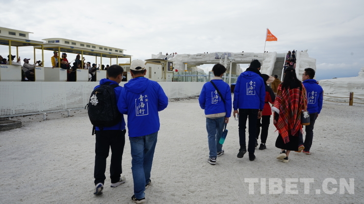 圖為導游小段向香港青少年學子介紹鹽湖景區(qū)。140余人的大隊伍卻只有少數(shù)人跟上,其他人早已迷失于茶卡鹽湖的美景之中。攝影:李泓慶