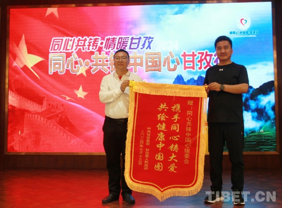 圖為甘孜縣縣委副書(shū)記、縣長(zhǎng)其太(右)向“同心·共鑄中國(guó)心”組委會(huì)贈(zèng)送錦旗 攝影:劉莉