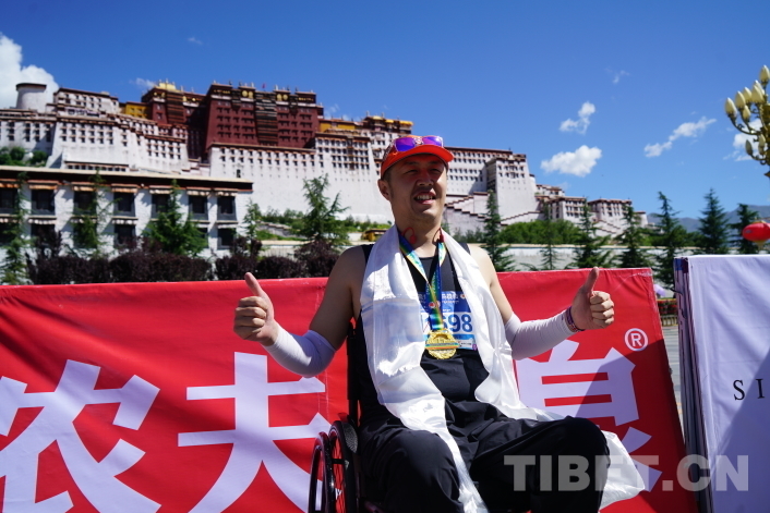 布達(dá)拉宮終點(diǎn)處人頭攢動(dòng),工作人員為每一位完賽選手獻(xiàn)上哈達(dá)、掛上獎(jiǎng)牌,和選手們一起享受拉薩半程馬拉松挑戰(zhàn)完成的滿足與快樂(lè)。來(lái)自山東濟(jì)寧的任先振是本屆拉薩半程馬拉松唯一一位輪椅半程選手,他告訴記者,這一路他不僅沒(méi)有高反,且因?yàn)槭亲约簠⒓舆^(guò)最高海拔的半程馬拉松而更加富有激情,在拉薩他感受到了許多來(lái)自藏族同胞的關(guān)心與溫暖,來(lái)到高原前他已經(jīng)報(bào)名了拉薩旅游團(tuán),他要去看看屬于雪域高原的美景。