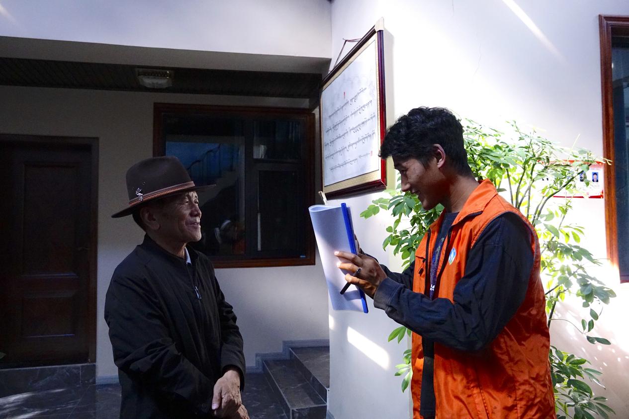 圖為專職網(wǎng)格員拉巴頓珠正在入戶調(diào)研以更新平臺(tái)信息。 攝影:邊子捷