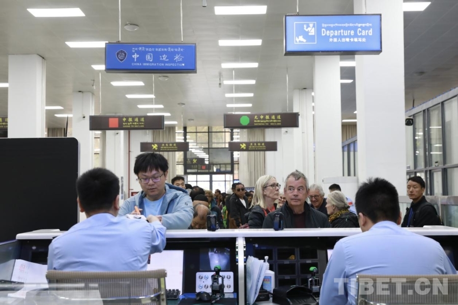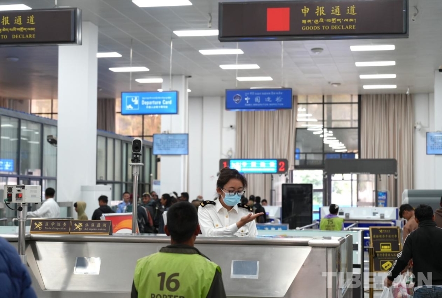圖為吉隆口岸移民管理警察正在驗放出境旅客