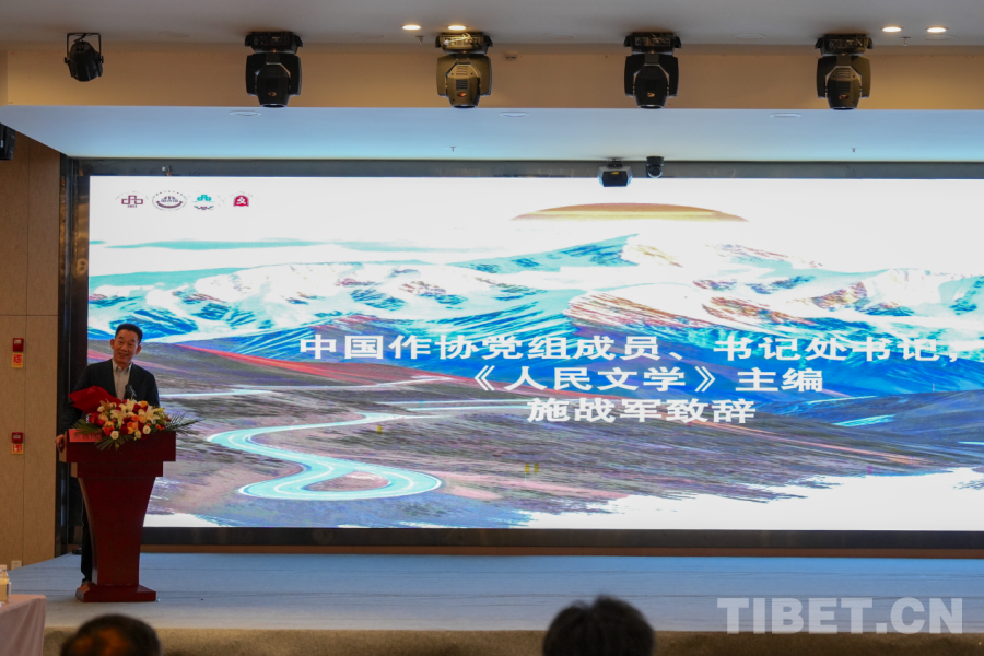 圖為長(zhǎng)詩(shī)《喜馬拉雅》作者,第八屆魯迅文學(xué)獎(jiǎng)獲得者、西藏自治區(qū)文聯(lián)副主席陳人杰致辭 攝影:邊子捷