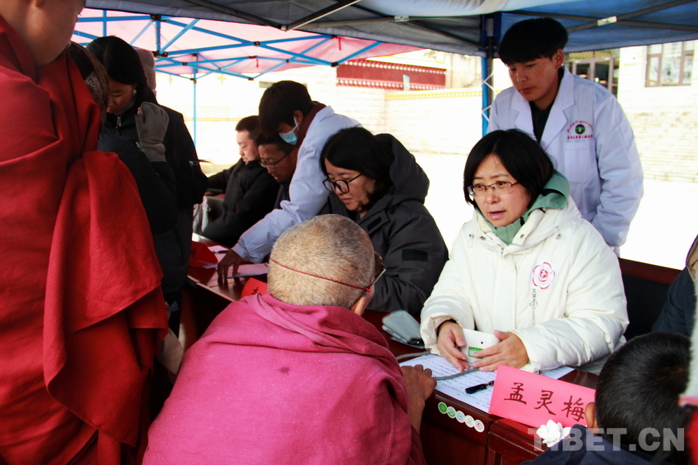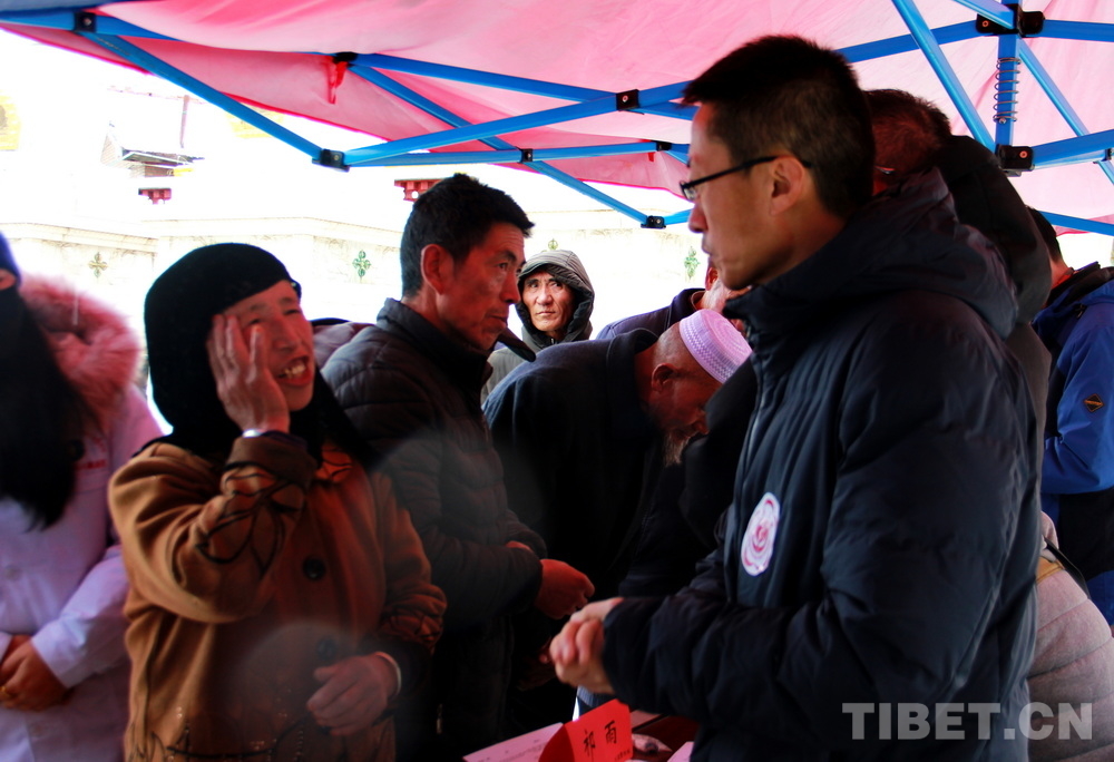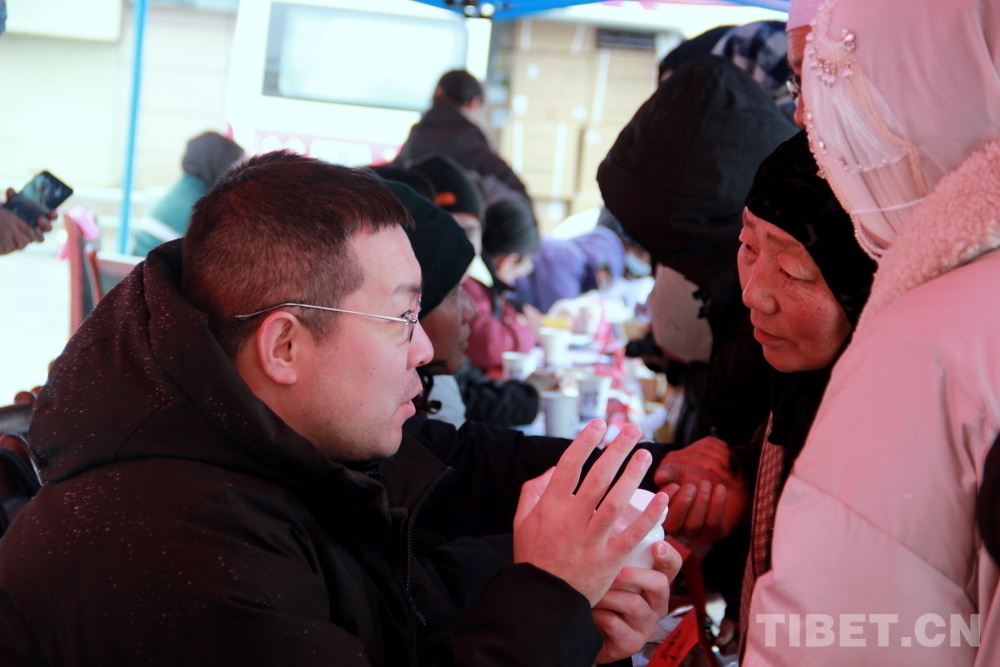 在郎木寺義診點(diǎn),此前為了容納更多群眾就診,因此將義診點(diǎn)設(shè)在了寺院門外的小廣場(chǎng)。盡管大雪紛飛,但提前得知義診消息的群眾已經(jīng)陸續(xù)趕來,擔(dān)心臨時(shí)更換義診場(chǎng)所影響后續(xù)前來的群眾就診,醫(yī)務(wù)志愿者們毫無怨言地在臨時(shí)搭起的防雨棚下按時(shí)開始了義診。