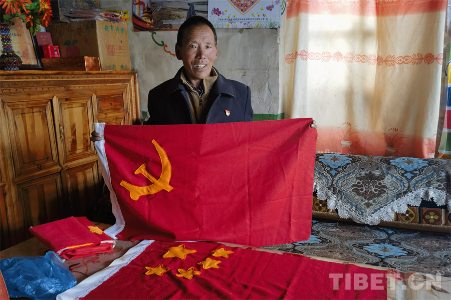 圖為多吉才覺展示親手縫制的國旗和黨旗 攝影:蔣馨悅
