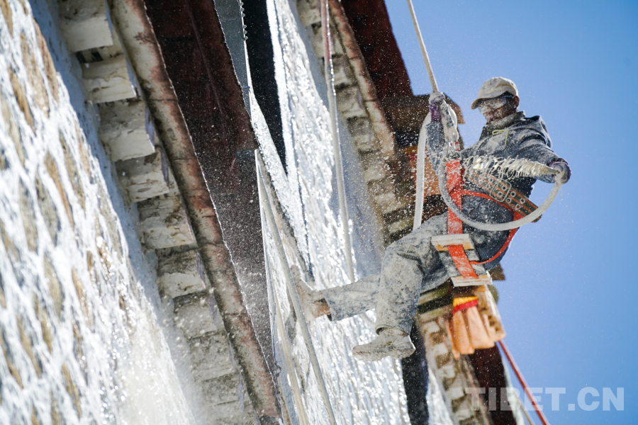 圖為專(zhuān)業(yè)工人正在為布達(dá)拉宮外墻噴涂涂料 攝影:邊子捷