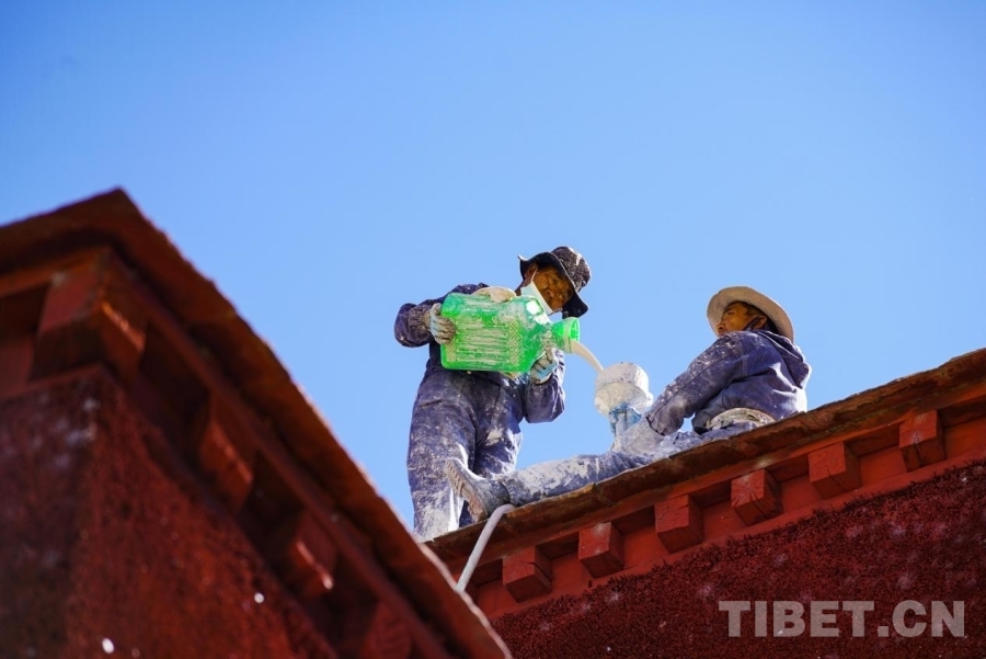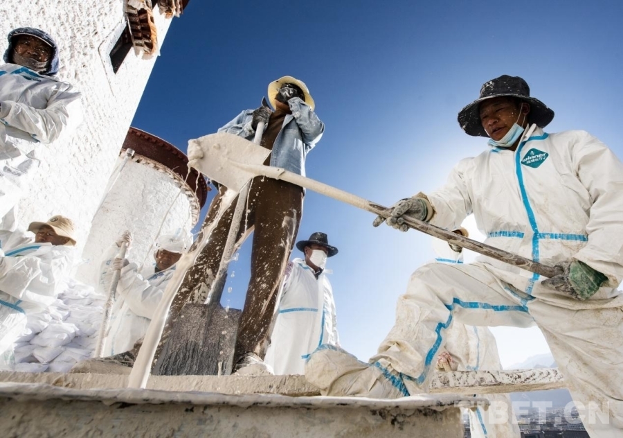 布達(dá)拉宮外墻粉刷一般持續(xù)7-10天,要在藏歷的9月22日之前全部完成。此刻,拉薩的雨季剛剛結(jié)束,冬季的寒冷結(jié)冰尚未到來(lái),每年大家都趕在入冬之前完成這一浩大的粉刷工程。