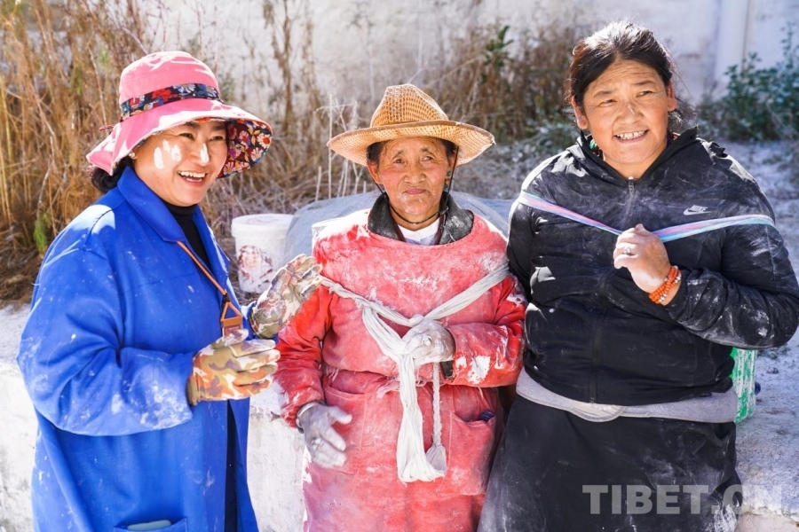 在布達(dá)拉宮粉刷現(xiàn)場(chǎng),有每年都堅(jiān)持參與的拉薩市民,有從遙遠(yuǎn)昌都、那曲等地專(zhuān)程趕來(lái)的群眾,亦有冬游西藏恰巧遇到參與其中的外地游客。他們不分年齡、不分性別,一起在拉薩溫暖的秋日暖陽(yáng)中用熱情洋溢的笑臉參與到這一“甜蜜”的粉刷活動(dòng)中來(lái)。
