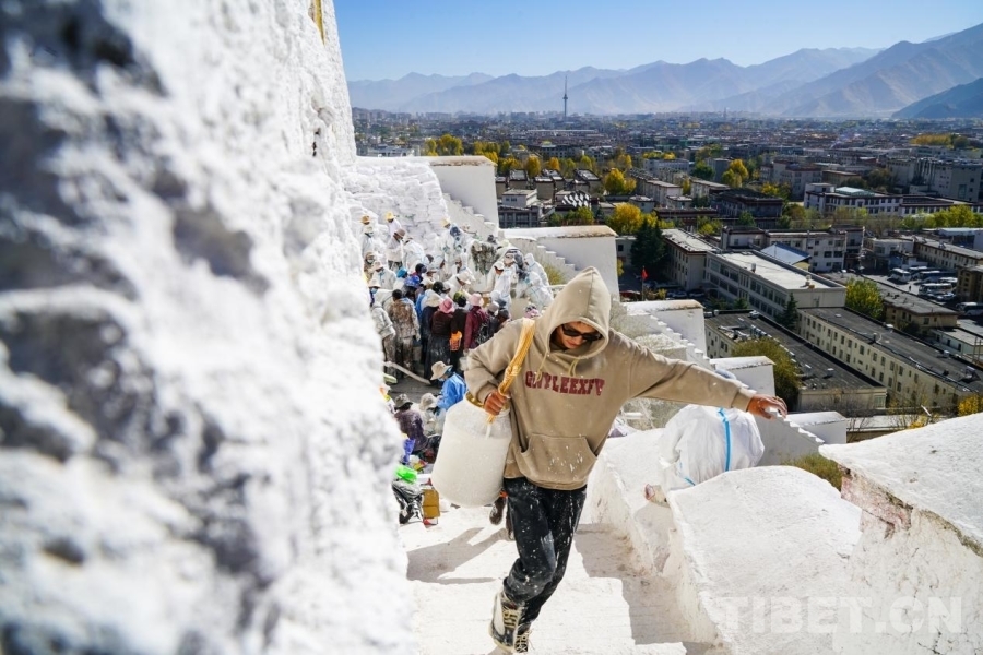 中國(guó)西藏網(wǎng)訊 巍峨的布達(dá)拉宮,是日光之城拉薩的象征,悠久的歷史,古老的文化,博得世人的矚目和贊賞。每到金秋時(shí)分,布達(dá)拉宮也即將進(jìn)入一年中最“絢彩”的時(shí)刻,大量當(dāng)?shù)厝罕姾陀慰突碇驹刚?,共同為粉刷布達(dá)拉宮的外墻而做準(zhǔn)備,以便更好地保護(hù)這一古老的世界文化遺產(chǎn)建筑。