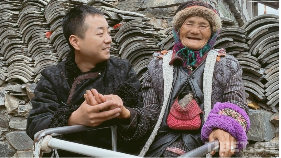 第二個(gè)老師是兩腿癱瘓的獨(dú)居藏族老人斯達(dá)木,是楊斐在第一次下鄉(xiāng)時(shí)遇到的。老人耐心教楊斐藏語,楊斐給老人帶去了輪椅、拐杖、紙尿褲等生活用品,兩人感情日漸深厚,他認(rèn)斯達(dá)木老人當(dāng)了干媽。