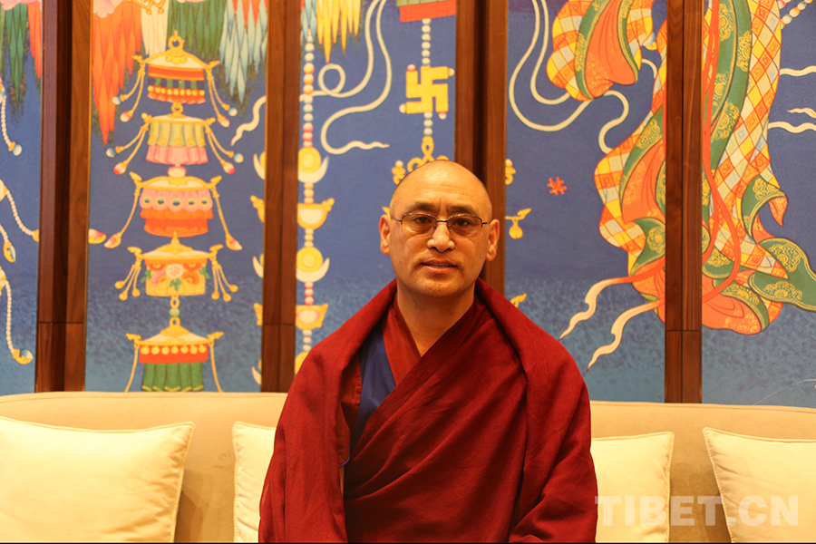 圖為藏傳佛教第十六屆“拓然巴”高級學(xué)銜獲得者、旺達寺民管會主任澤翁巴登接受記者采訪 攝影:龍真多吉