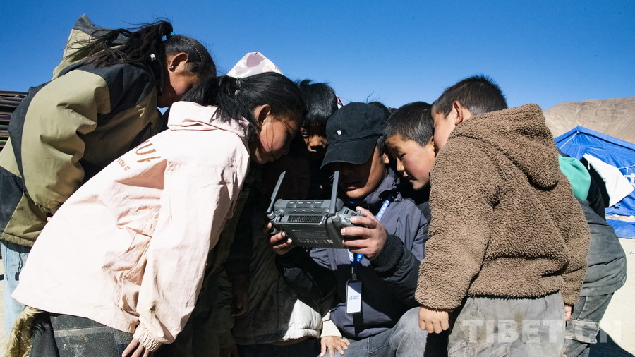 圖為在左措村受災(zāi)群眾安置點(diǎn),小朋友們圍觀無人機(jī)空中視角 攝影:趙振宇