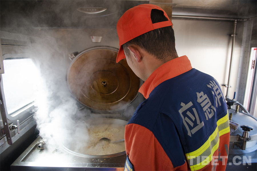 圖為山南市消防救援支隊(duì)消防員正在為受災(zāi)群眾準(zhǔn)備熱餐 攝影:趙振宇