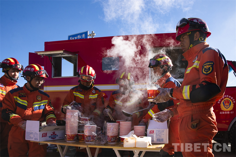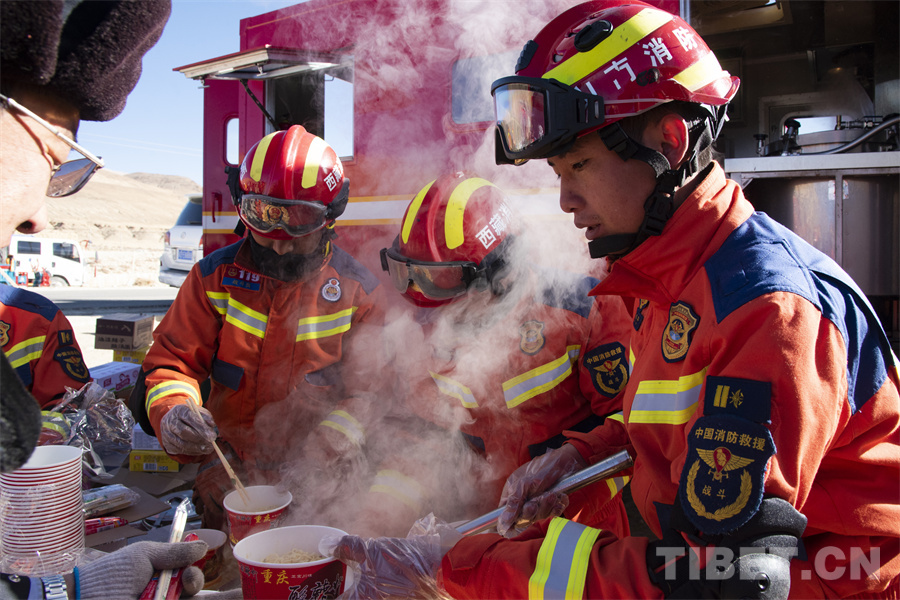 圖為山南市消防救援支隊(duì)消防員在受災(zāi)安置點(diǎn)前發(fā)放熱餐 攝影:趙振宇