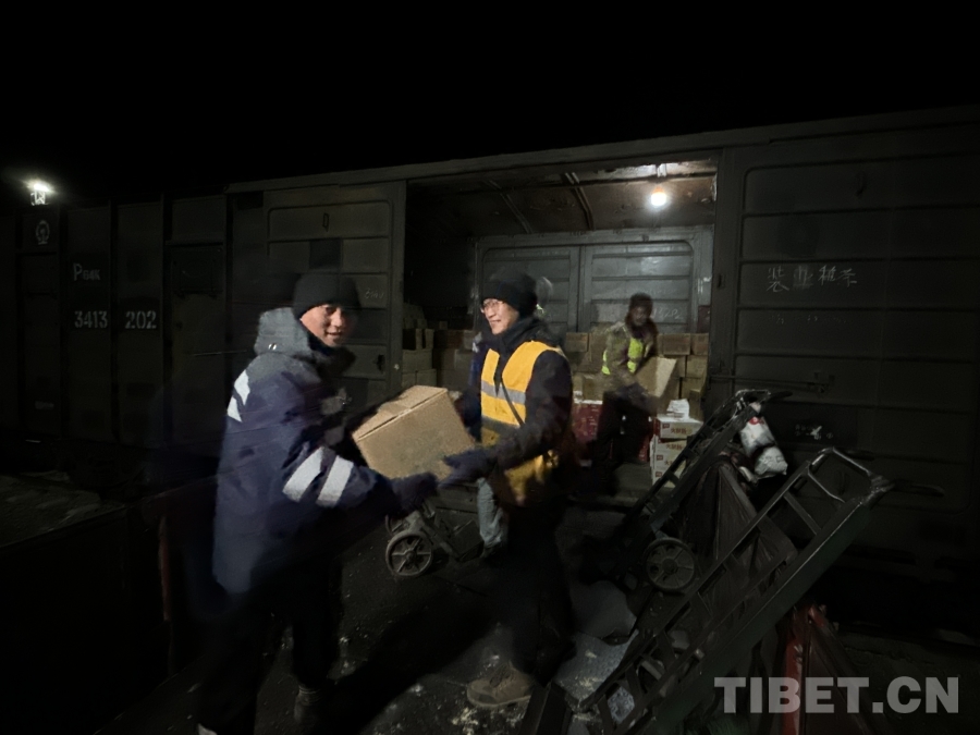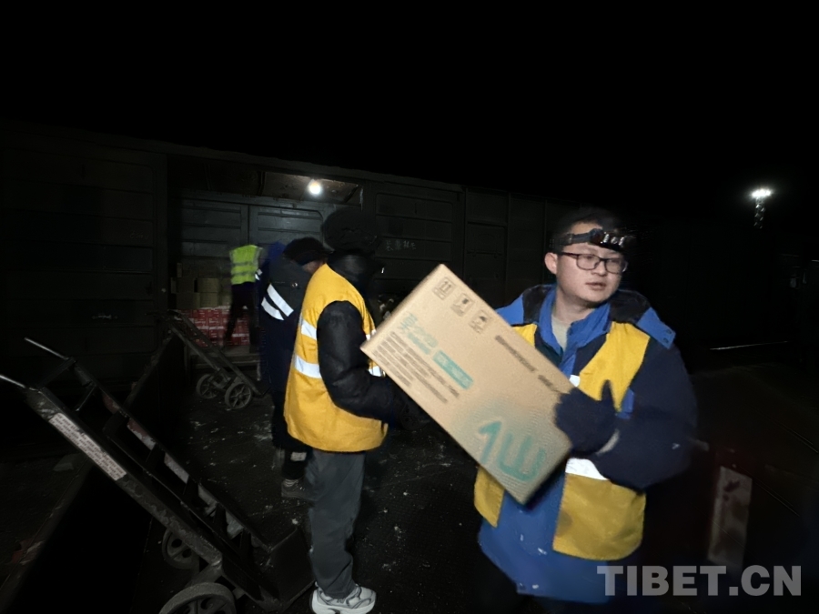 圖為首趟抗震救災(zāi)物資專列抵達(dá)日喀則,工作人員爭分奪秒進(jìn)行物資搶卸轉(zhuǎn)運 攝影:周悅翔 馬生明