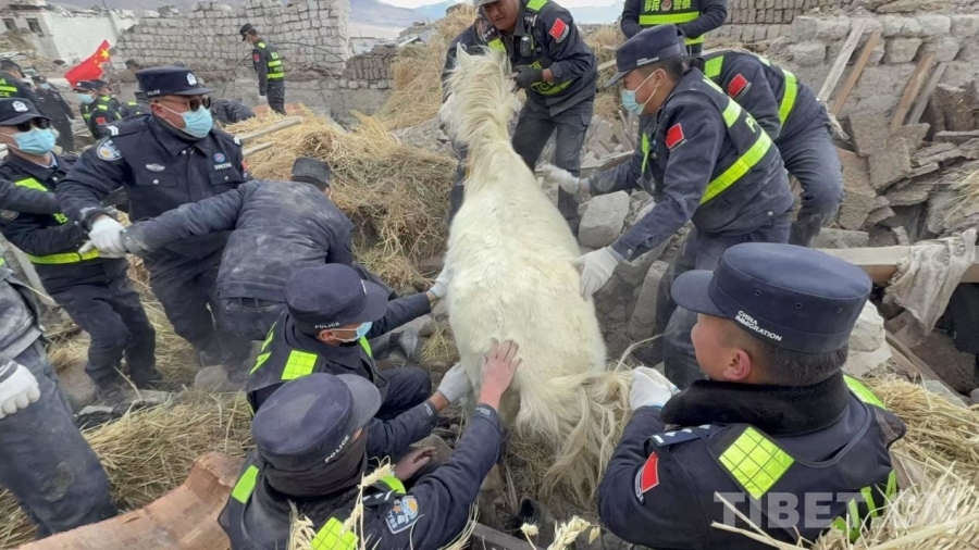 玉白村海拔4400米,共有29戶村民,此次地震中房屋幾乎全部倒塌。民警抵達(dá)現(xiàn)場(chǎng)后,發(fā)現(xiàn)村民扎西多布杰的羊圈倒塌,58頭羊和稻草全部被掩埋。