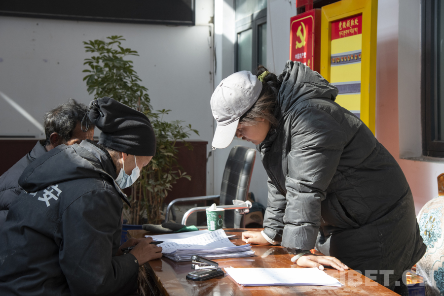 圖為嘎白村村干部塔杰(左)、頓珠巴姆(中)、阿旺德金(右)正在村委會統(tǒng)計相關(guān)安置數(shù)據(jù) 攝影:趙振宇