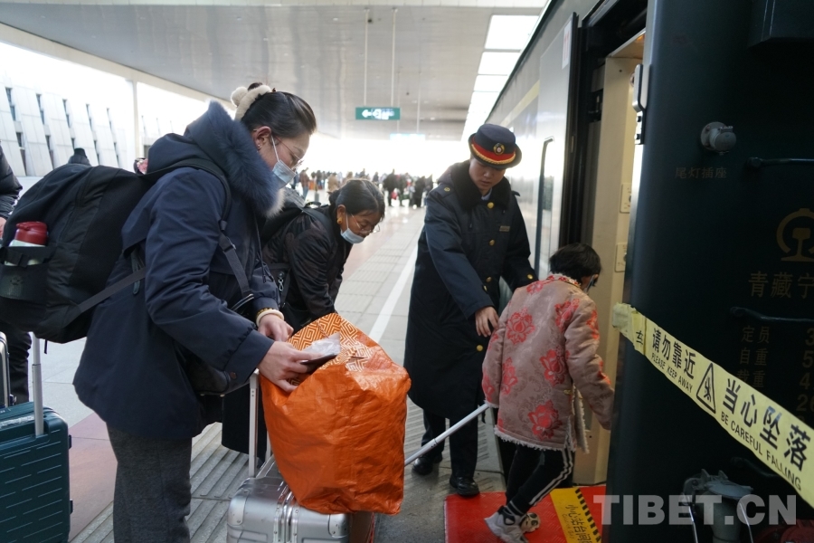 不一會(huì),等待檢票上車(chē)的人排起了長(zhǎng)隊(duì),他們是來(lái)拉薩朝圣結(jié)束準(zhǔn)備回家的藏族老人,他們是結(jié)束了一年工作回鄉(xiāng)過(guò)年的外地務(wù)工人員,他們是來(lái)拉薩探親的母子,他們是去成都與家人團(tuán)聚的母女三人……短短15節(jié)車(chē)廂,囊括了中華民族各族群眾在春節(jié)來(lái)臨時(shí)短暫相聚于火車(chē)上的世間百態(tài):大包小包的行李、火車(chē)上準(zhǔn)備的食物、手中的轉(zhuǎn)經(jīng)筒、和媽媽撒嬌的孩子、手機(jī)上跳動(dòng)的畫(huà)面……