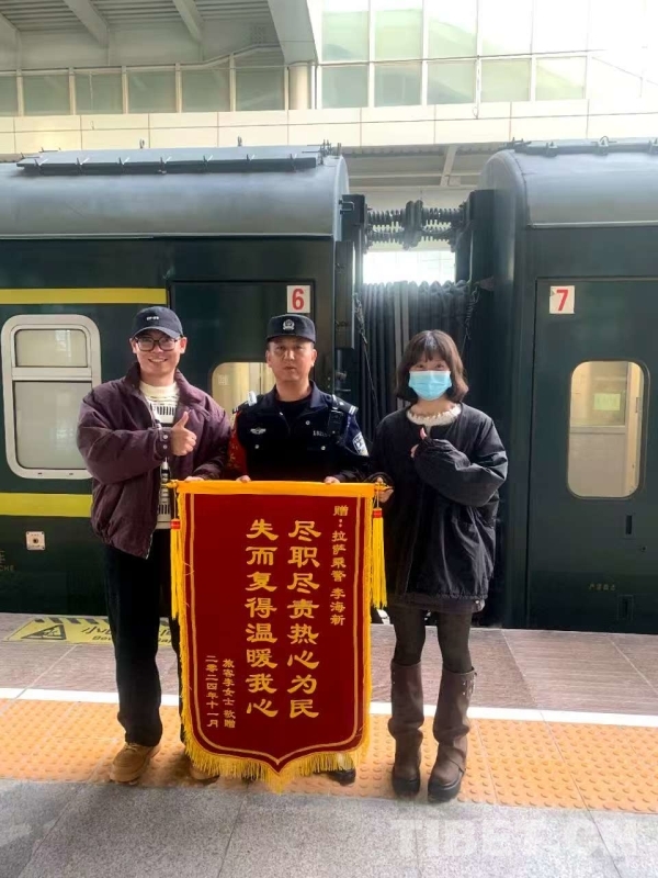 圖為旅客為李警長(zhǎng)送錦旗。2024年11月,李警長(zhǎng)在列車(chē)巡檢時(shí)發(fā)現(xiàn)一部被旅客遺失的手機(jī),在與失主取得聯(lián)系后將手機(jī)送還?!∈茉L者供圖