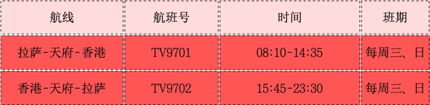 該航線由西藏航空?qǐng)?zhí)行,計(jì)劃每周三、周日?qǐng)?zhí)飛,航班號(hào)TV9701,于8:10拉薩起飛,在天府經(jīng)停后,14:35到達(dá)香港;返程航班號(hào)TV9702,于15:45香港起飛,在天府經(jīng)停后,23:30到達(dá)拉薩。