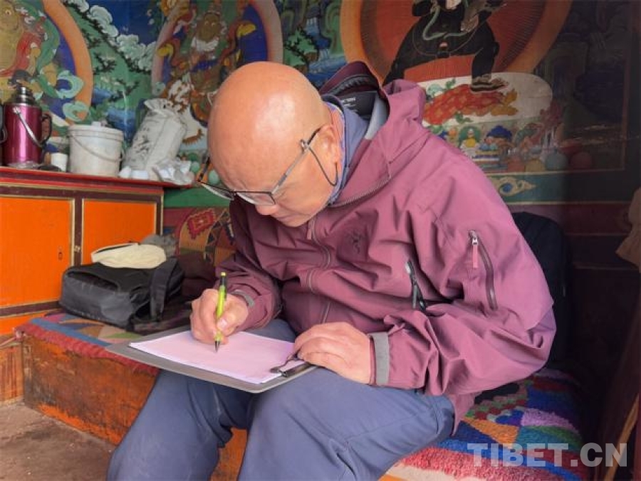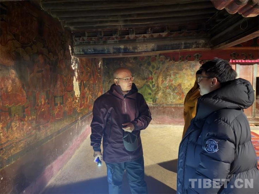 圖為羅文華在薩迦寺內認真測繪 攝影:王妍丹