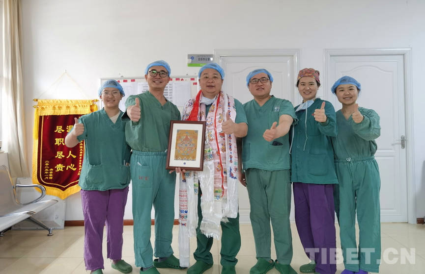 圖為阿壩州人民醫(yī)院口腔科團(tuán)隊(duì)向火箭軍特色醫(yī)學(xué)中心口腔科主治醫(yī)師張曉然(左三)獻(xiàn)上哈達(dá)致敬
