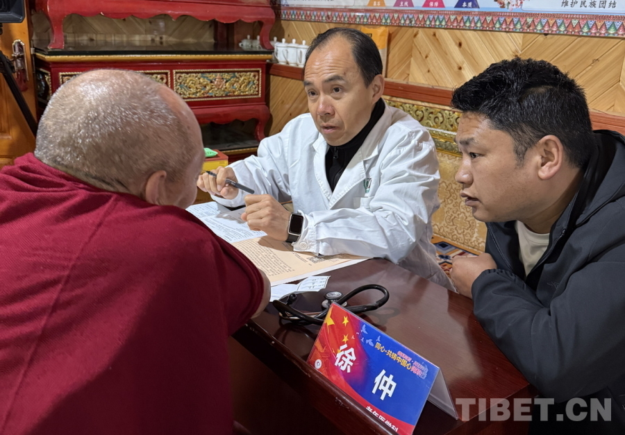 圖為醫(yī)療專家們在草登寺義診,廣州醫(yī)科大學(xué)附屬第三醫(yī)院老年醫(yī)學(xué)科主任、主任醫(yī)師徐仲正在與草登寺僧人溝通病情 攝影:喇應(yīng)強