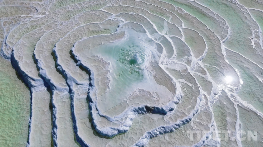 圖為察爾汗鹽湖內(nèi)的鹽池。在一些將要干涸的鹽池上,湖水表面會(huì)飄蕩著鹽花結(jié)晶,同時(shí)池底也會(huì)結(jié)晶為層層鹵石,這種鹵石的硬度很高,性質(zhì)也較為穩(wěn)定,足以修建成道路供行人車輛通行 供圖:青海省文化和旅游廳