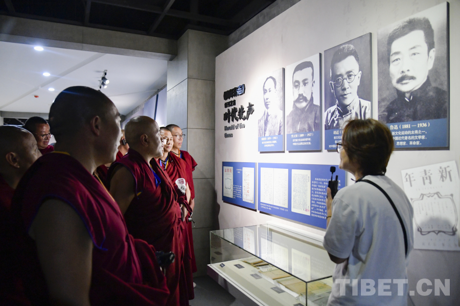 圖為在嘉興五四文化博物館內(nèi)西藏佛學(xué)院師生認(rèn)真聆聽關(guān)于五四運動的講解 攝影:趙振宇