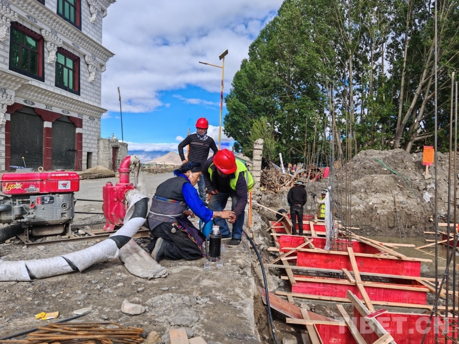 在仲康村巴桑家的重建工地上,工程已進(jìn)入鋼筋捆扎階段。一場(chǎng)突如其來的夜雨導(dǎo)致基坑積水。清晨七八點(diǎn),施工隊(duì)員已在基坑中忙碌開來,有的加緊捆扎鋼筋,有的尋找水泵抽水。日頭漸高,汗水浸濕了工人們的額頭,他們卻無暇休息。這時(shí),阿媽巴桑提著一壺剛煮好的甜茶走來,就地一杯杯沏好,熱情地招呼這群“小伙子”?!耙郧暗睦戏孔诱饓牧?,現(xiàn)在黨和政府給我們建更好的新房子,日子肯定越過越有盼頭!”樸實(shí)的話語(yǔ)里,滿是她對(duì)未來的憧憬和對(duì)援助的感激。
