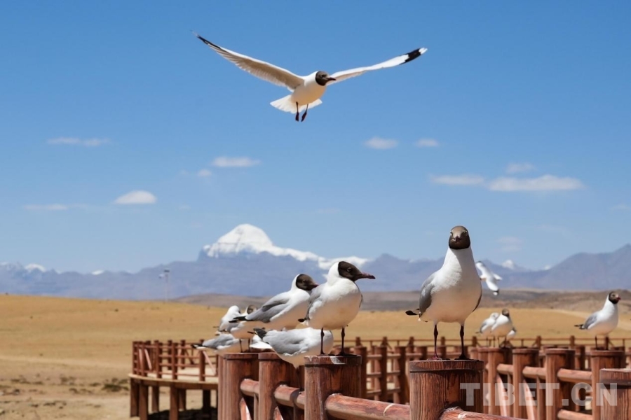 圖為立于瑪旁雍錯旁棧道上的棕頭鷗群,遠(yuǎn)處是岡仁波齊峰 攝影:邊子捷