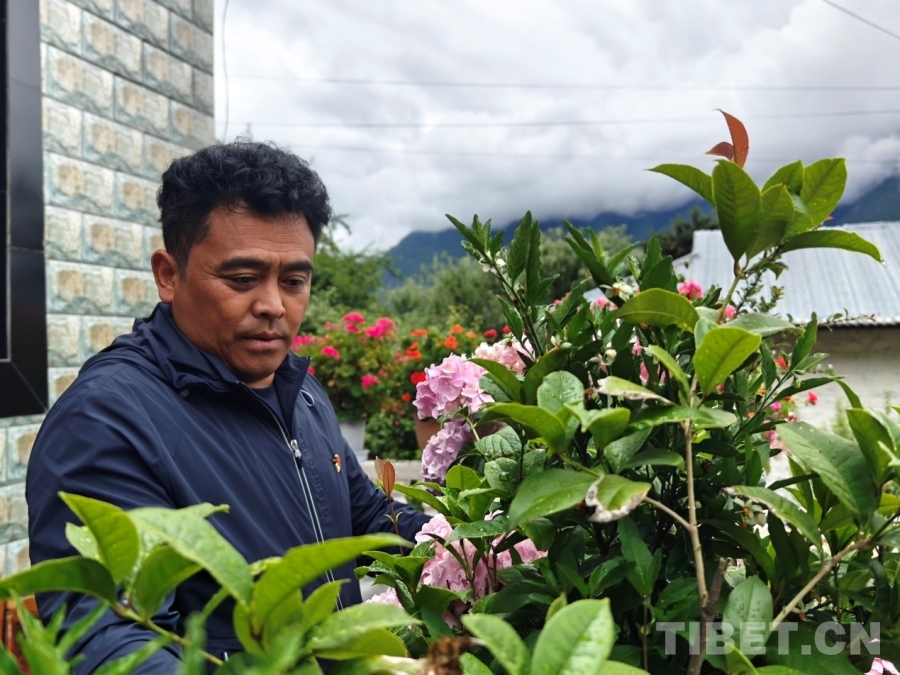 圖為村黨支部宣傳委員、村委會副主任尼瑪多吉在打理自家院子