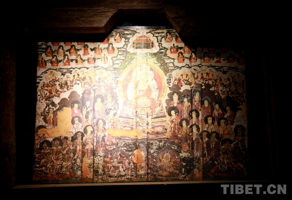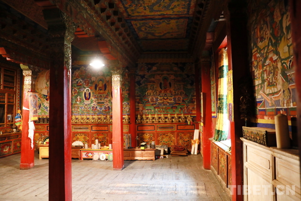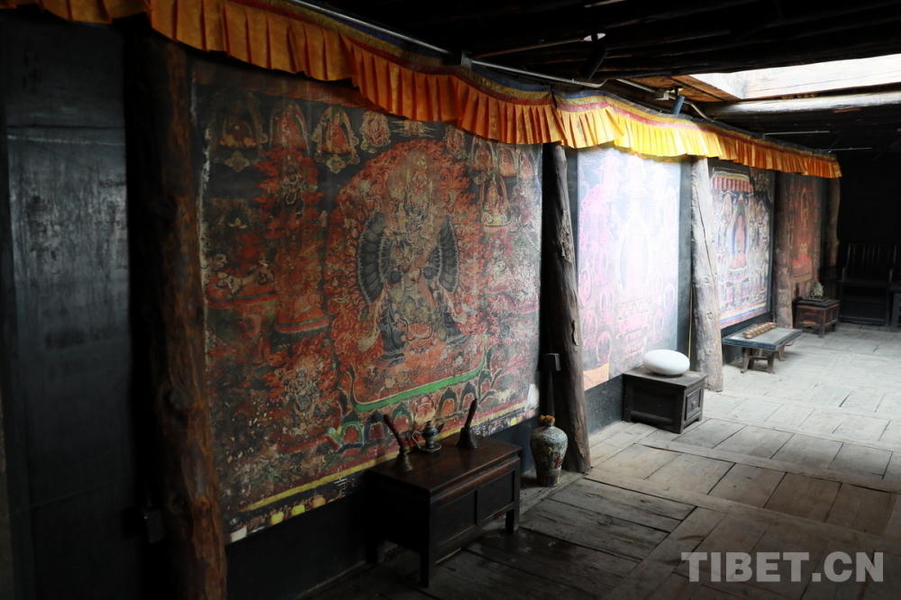 宗薩木府最驚艷的是其經(jīng)堂中歷經(jīng)380余年歷史仍色彩絢麗、保存完整的整堂壁畫(huà)。新中國(guó)成立后,宗薩木府曾被收歸公有,許多無(wú)房的當(dāng)?shù)刎毨罕姳话才抛∵M(jìn)了這里?!拔母铩睍r(shí)期,宗薩木府的經(jīng)堂被作為村里的倉(cāng)庫(kù),人們用報(bào)紙糊住壁畫(huà),使這些藝術(shù)珍品沒(méi)有受到“破四舊”的影響。