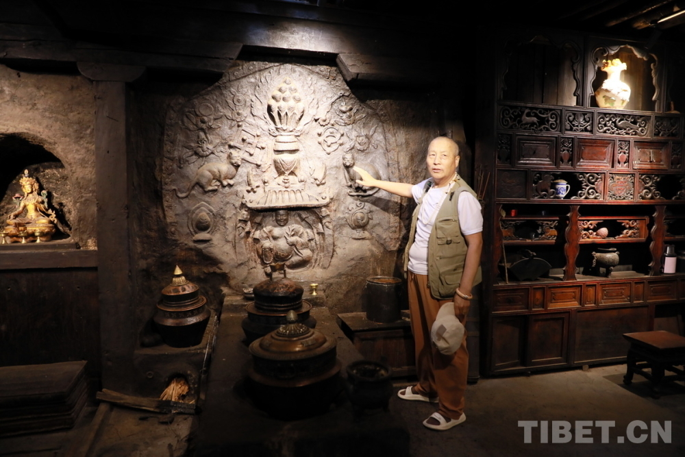 圖為丹真大叔正在介紹宗薩木府中的灶神泥塑 攝影:劉莉