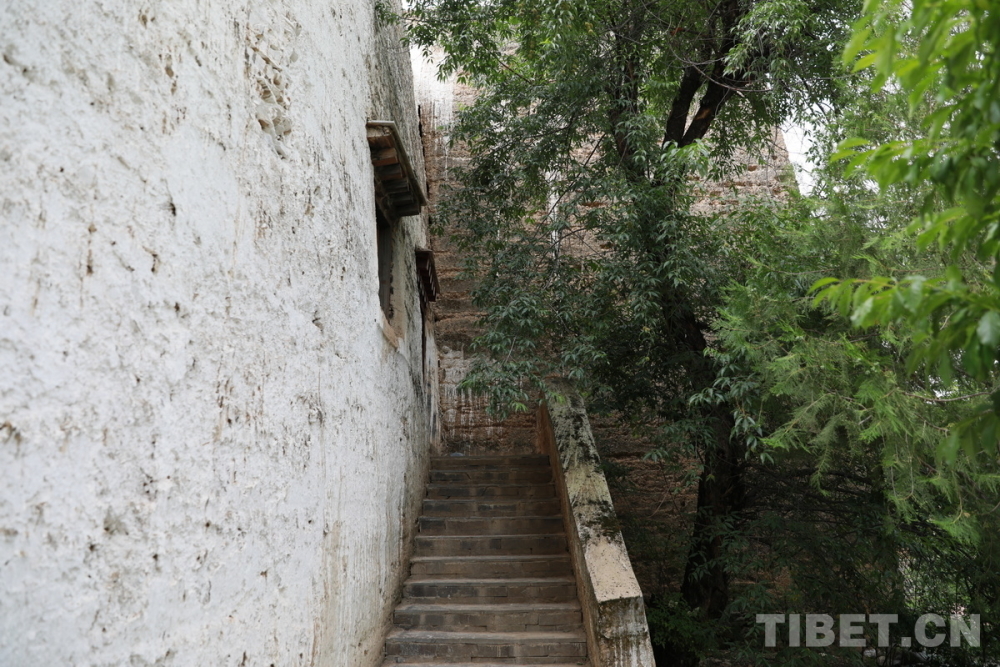 圖為位于四川省甘孜州鄉(xiāng)城縣青德鎮(zhèn)布機(jī)村的宗薩木府樓梯與旁邊的老山桃樹(shù) 攝影:劉莉