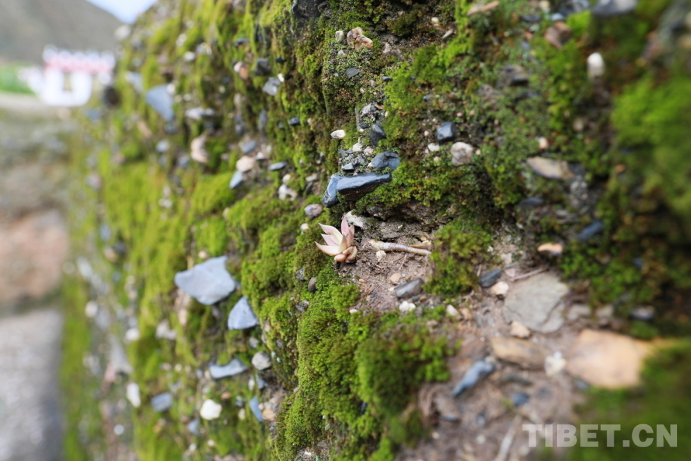 圖為位于四川省甘孜州鄉(xiāng)城縣青德鎮(zhèn)布機(jī)村的宗薩木府的古老夯土女兒墻滿(mǎn)覆青苔 攝影:劉莉