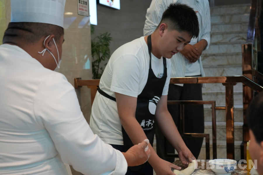 圖為胡俊賢在拉面師傅的指導(dǎo)下制作拉面 攝影:馮重霖