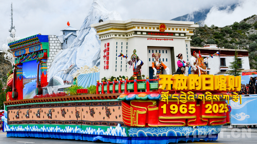 日喀則市彩車,彩車頭部為吉隆口岸造型,象征著日喀則作為面向南亞開放中心城市的特殊戰(zhàn)略地位。國(guó)門前,兩名著定日服飾的地震災(zāi)區(qū)群眾代表,手捧切瑪,表達(dá)對(duì)以習(xí)近平同志為核心的黨中央的深深感恩之情。