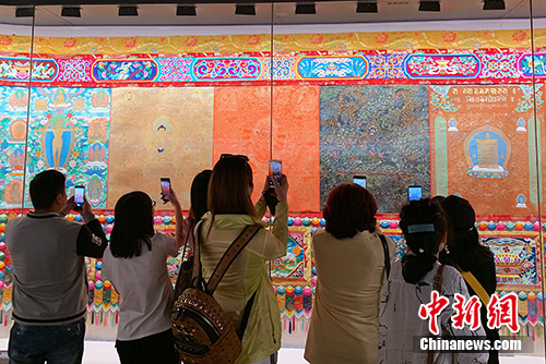 圖為唐卡作品吸引媒體代表拍照留念。中新社記者 馬銘言 攝