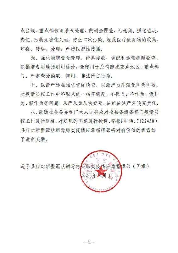 通告中還鼓勵社會各界和廣大人民群眾對全縣各級各部門疫情防控工作進行監(jiān)督,對發(fā)現(xiàn)的問題進行投訴、舉報(電話:0836—7122450), 縣應(yīng)對新型冠狀病毒肺炎疫情應(yīng)急指揮部將對有價值的線索給予適當(dāng)獎勵。(圖據(jù)道孚縣委宣傳部官方微信)