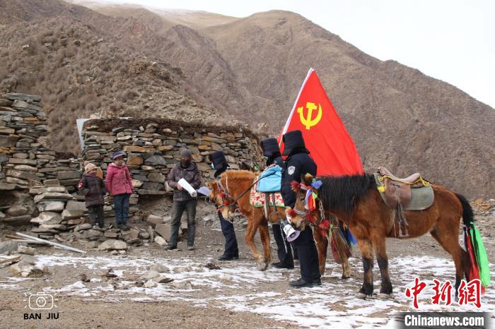 圖為馬背巡邏隊(duì)在轄區(qū)內(nèi)為牧民贈(zèng)送口罩、發(fā)放藏漢雙語(yǔ)宣傳資料。 扎西蘭周 攝