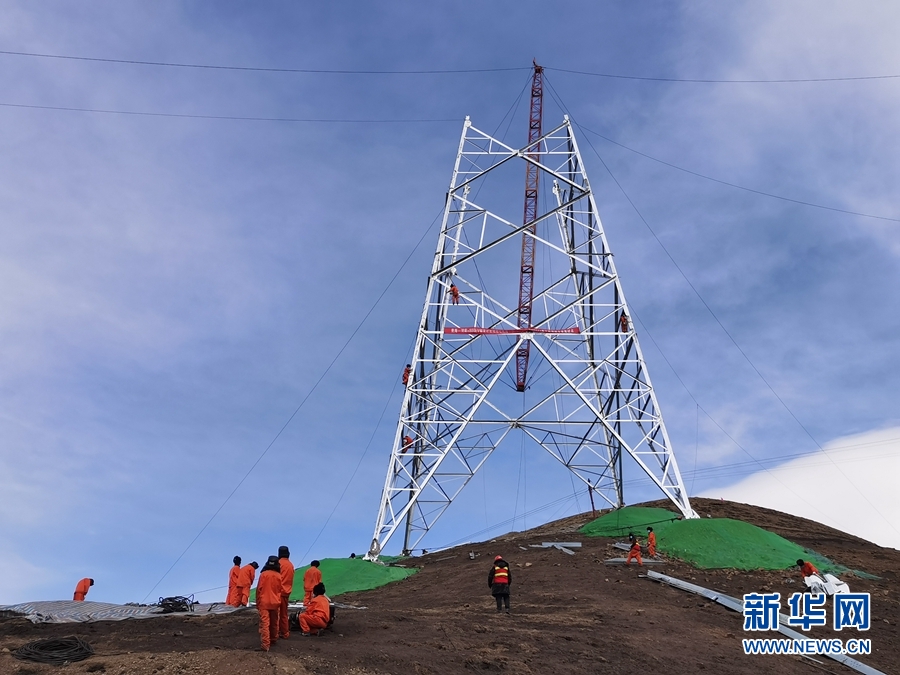 青海-河南±800千伏特高壓工程青2標(biāo)復(fù)工現(xiàn)場,施工人員進(jìn)行組塔作業(yè)。新華網(wǎng) 鄒建華 攝