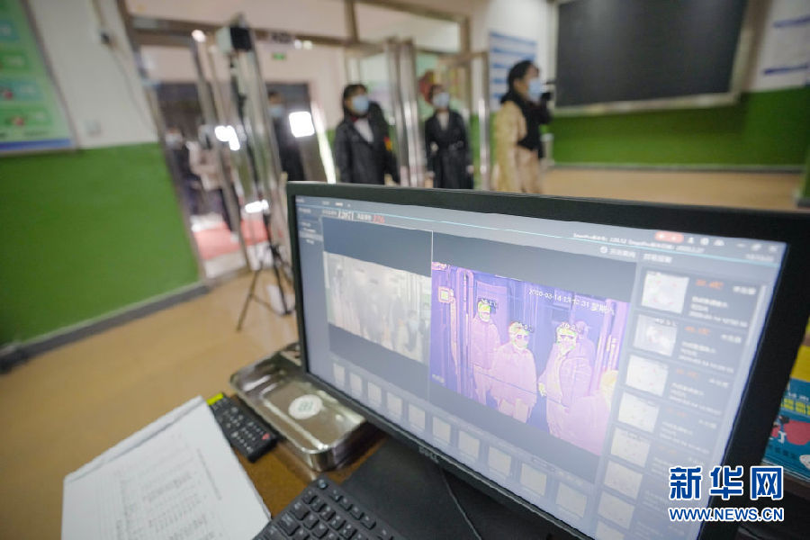 3月14日,在海北州第一高級中學教學樓入口處,學生在依次通過體溫監(jiān)控儀。新華社 吳剛 攝