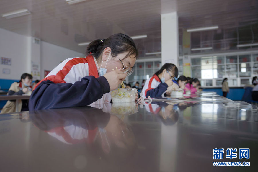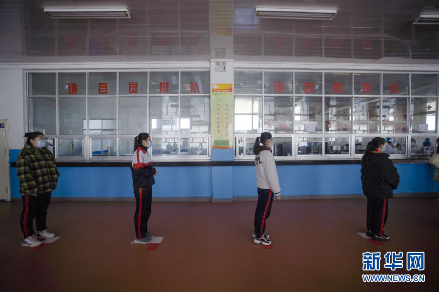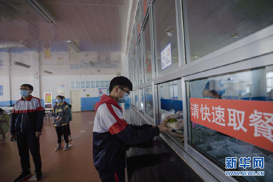 3月14日,海北州第一高級中學學生正在餐廳排隊取餐。新華社 吳剛 攝