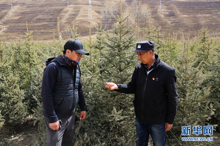公保旦增(右)與扎巴江才正在查看樹(shù)木長(zhǎng)勢(shì)情況。新華網(wǎng) 卡婭梅朵 攝