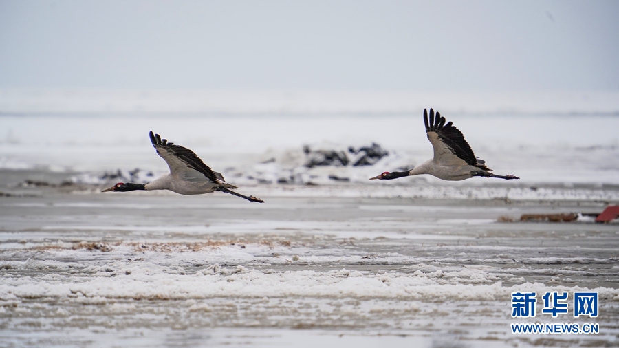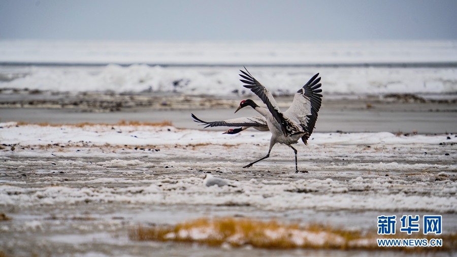 4月17日,受冷空氣影響,青海省海北藏族自治州剛察縣迎來(lái)一場(chǎng)春雪,兩只雪域“精靈”黑頸鶴在青海湖仙女灣景區(qū)“與雪共舞”,上演青海湖畔最美“雪中情”。