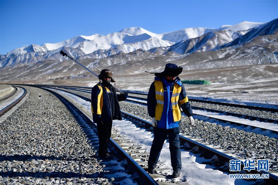 1月11日,于本蕃(左)和工友在青藏鐵路望昆站附近巡檢鐵道。新華社記者 張龍 攝