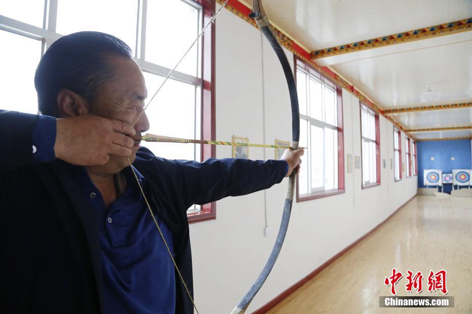 4月22日,青海省尖扎縣傳統(tǒng)牛角弓制作技藝代表性傳承人奧松多杰在車間射箭場內(nèi)測試制作好的牛角弓。當(dāng)日,在青海省尖扎縣,奧松多杰和徒弟們經(jīng)過切割,打磨水牛角和竹片、貼筋、繪圖等技藝,純手工制作出藏式傳統(tǒng)牛角弓。中新社記者 馬銘言 攝
