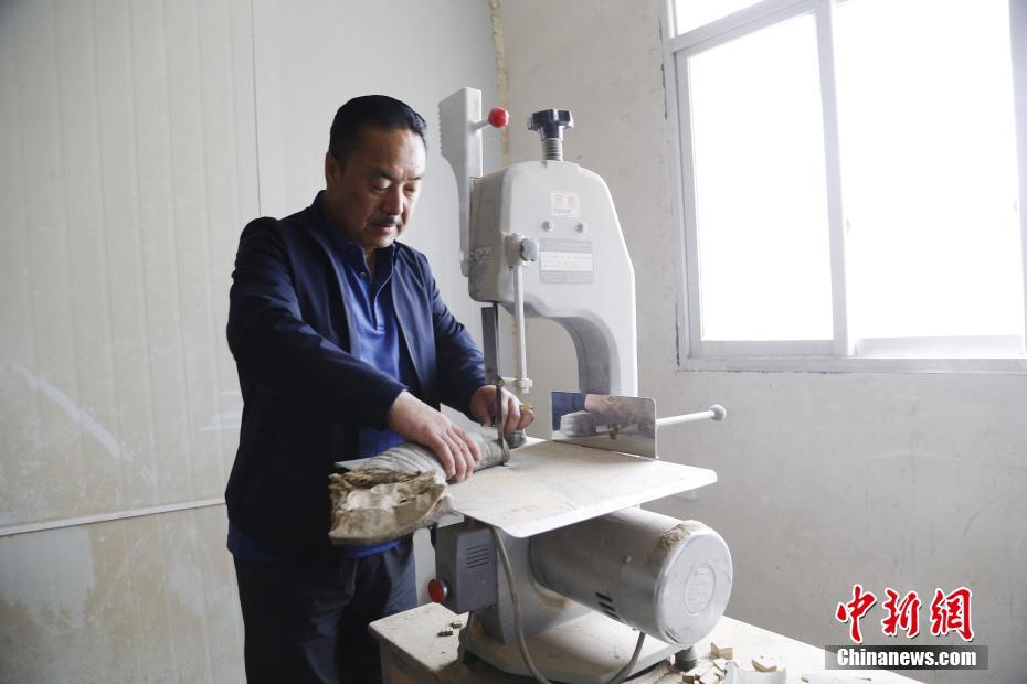 4月22日,青海省尖扎縣傳統(tǒng)牛角弓制作技藝代表性傳承人奧松多杰正在切割水牛角。當(dāng)日,在青海省尖扎縣,奧松多杰和徒弟們經(jīng)過切割,打磨水牛角和竹片、貼筋、繪圖等技藝,純手工制作出藏式傳統(tǒng)牛角弓。中新社記者 馬銘言 攝