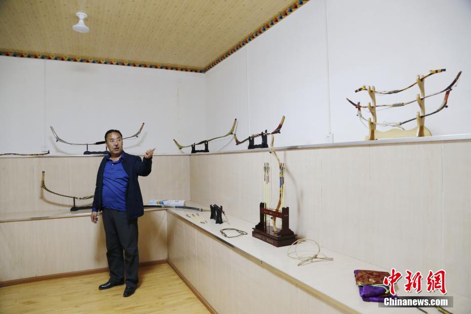 4月22日,青海省尖扎縣傳統(tǒng)牛角弓制作技藝代表性傳承人奧松多杰展示自己與徒弟制作的藏式傳統(tǒng)牛角弓。當(dāng)日,在青海省尖扎縣,奧松多杰和徒弟們經(jīng)過切割,打磨水牛角和竹片、貼筋、繪圖等技藝,純手工制作出藏式傳統(tǒng)牛角弓。中新社記者 馬銘言 攝