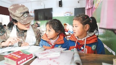 任務途中,官兵來到沿線藏族中學,與孩子們做游戲、輔導功課,開展國防教育,讓愛灑滿雪域高原。郭宏 攝